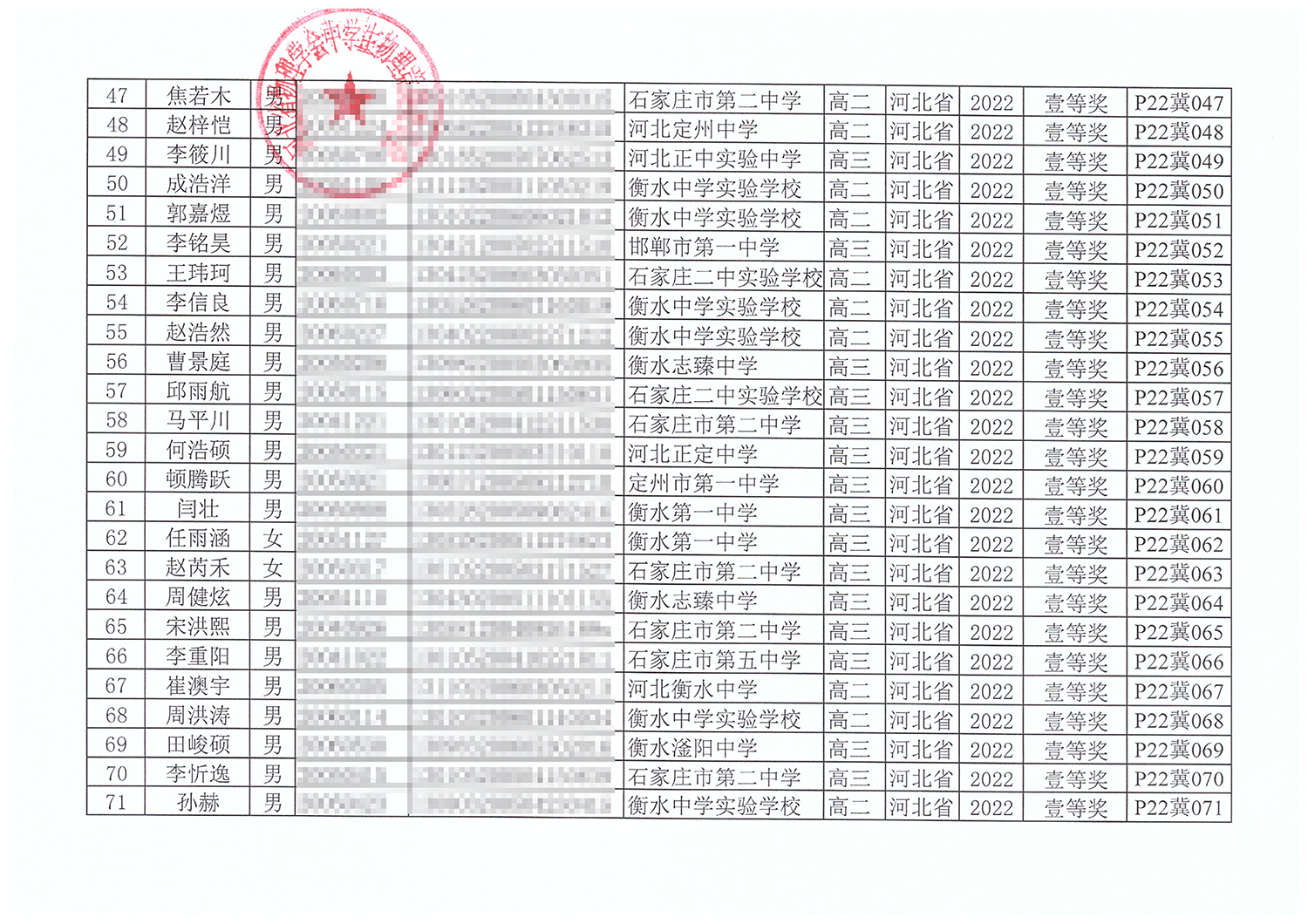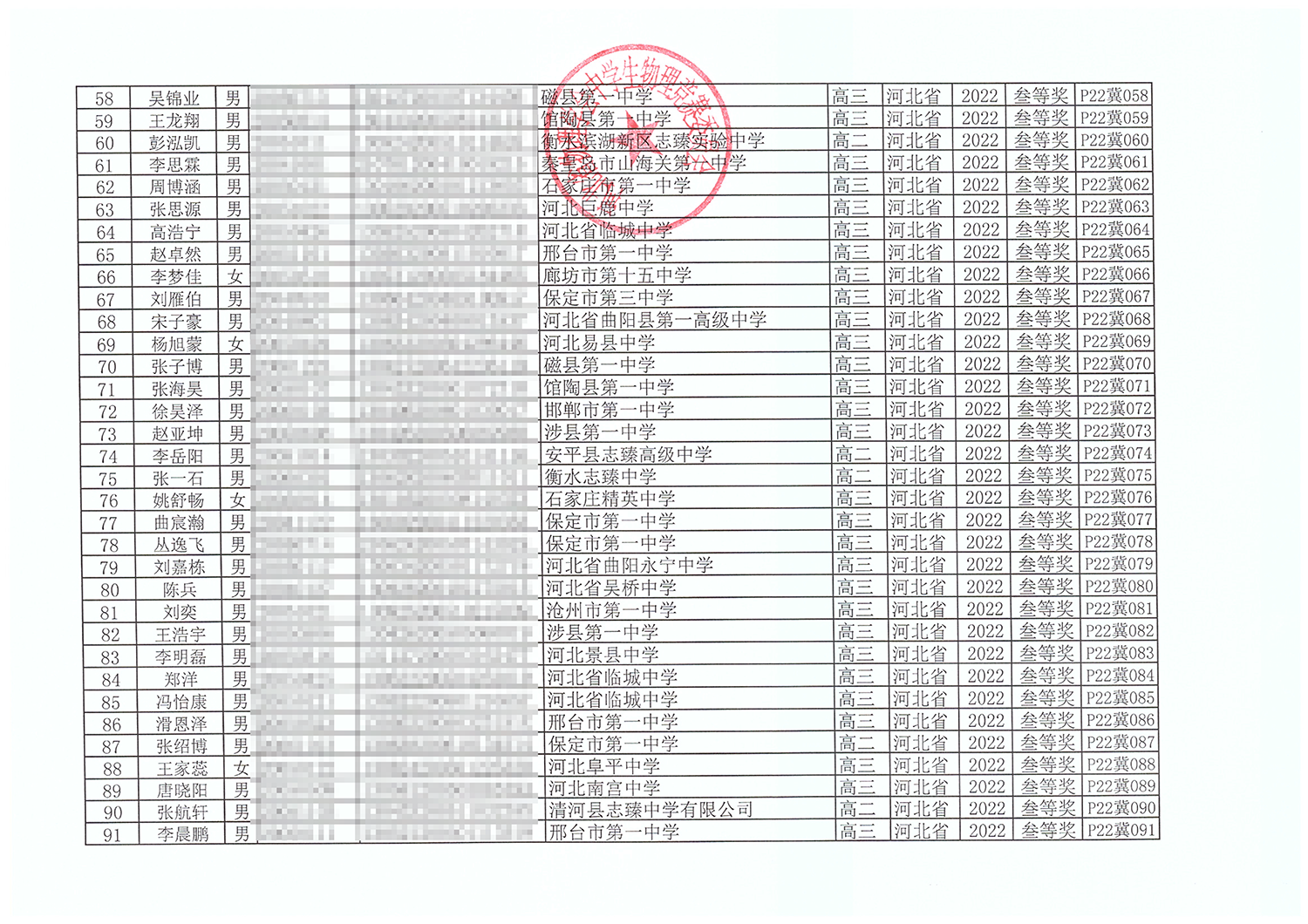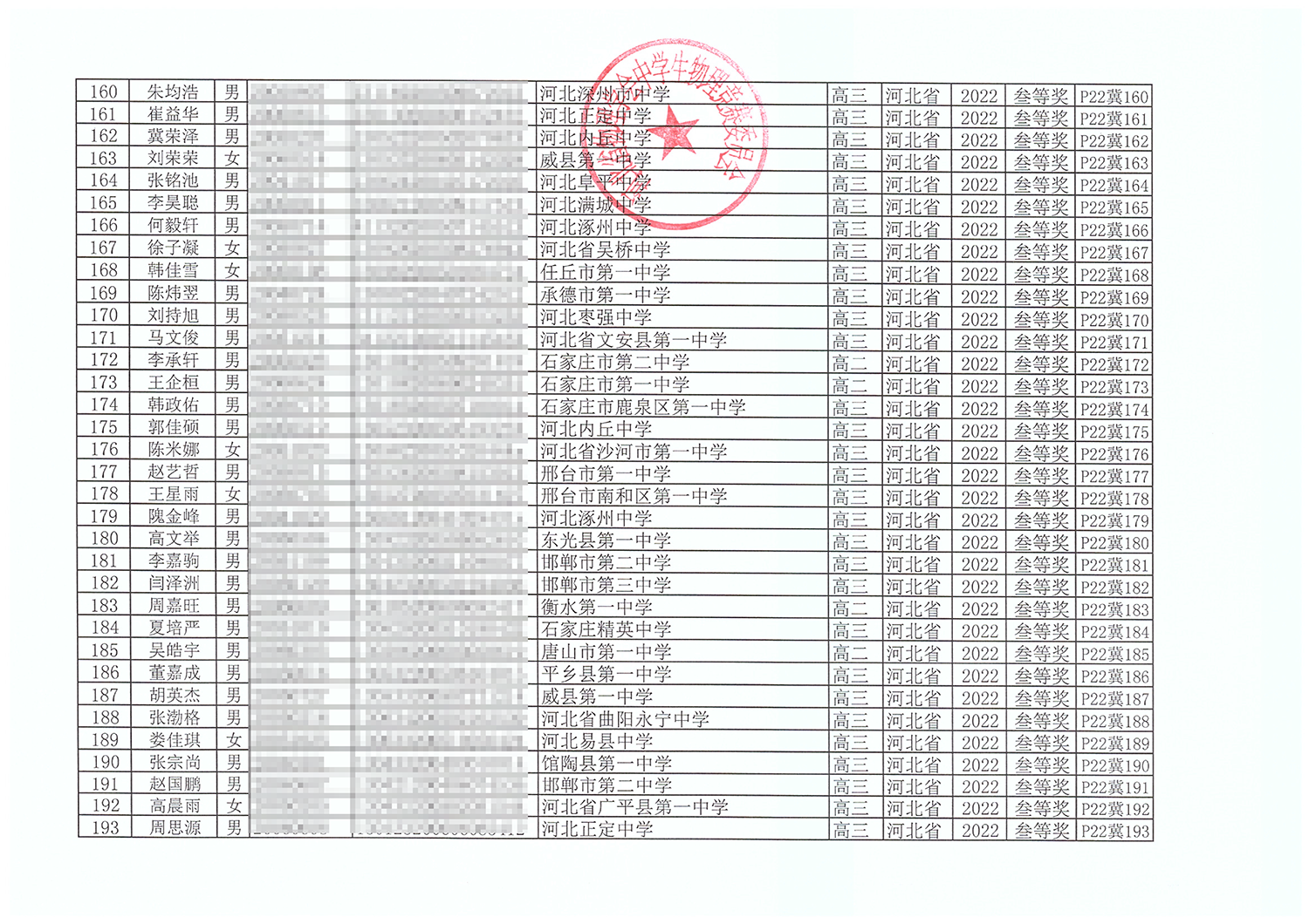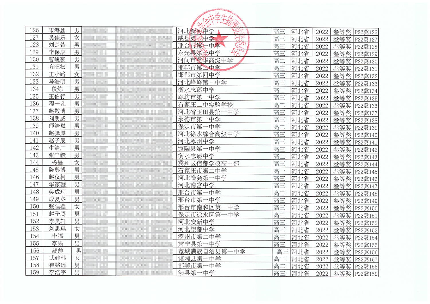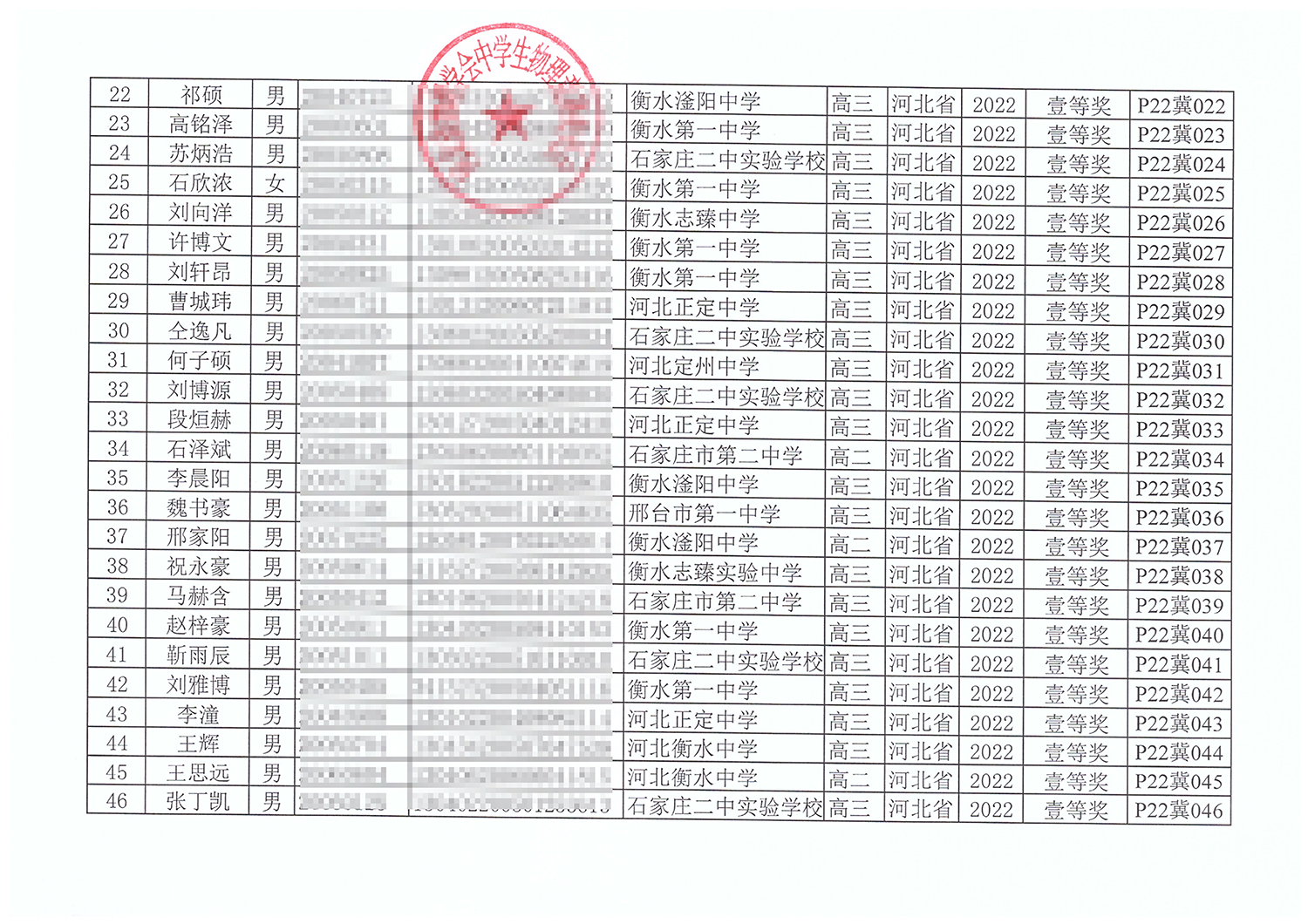 第39届全国中学生物理竞赛河北赛区获奖名单