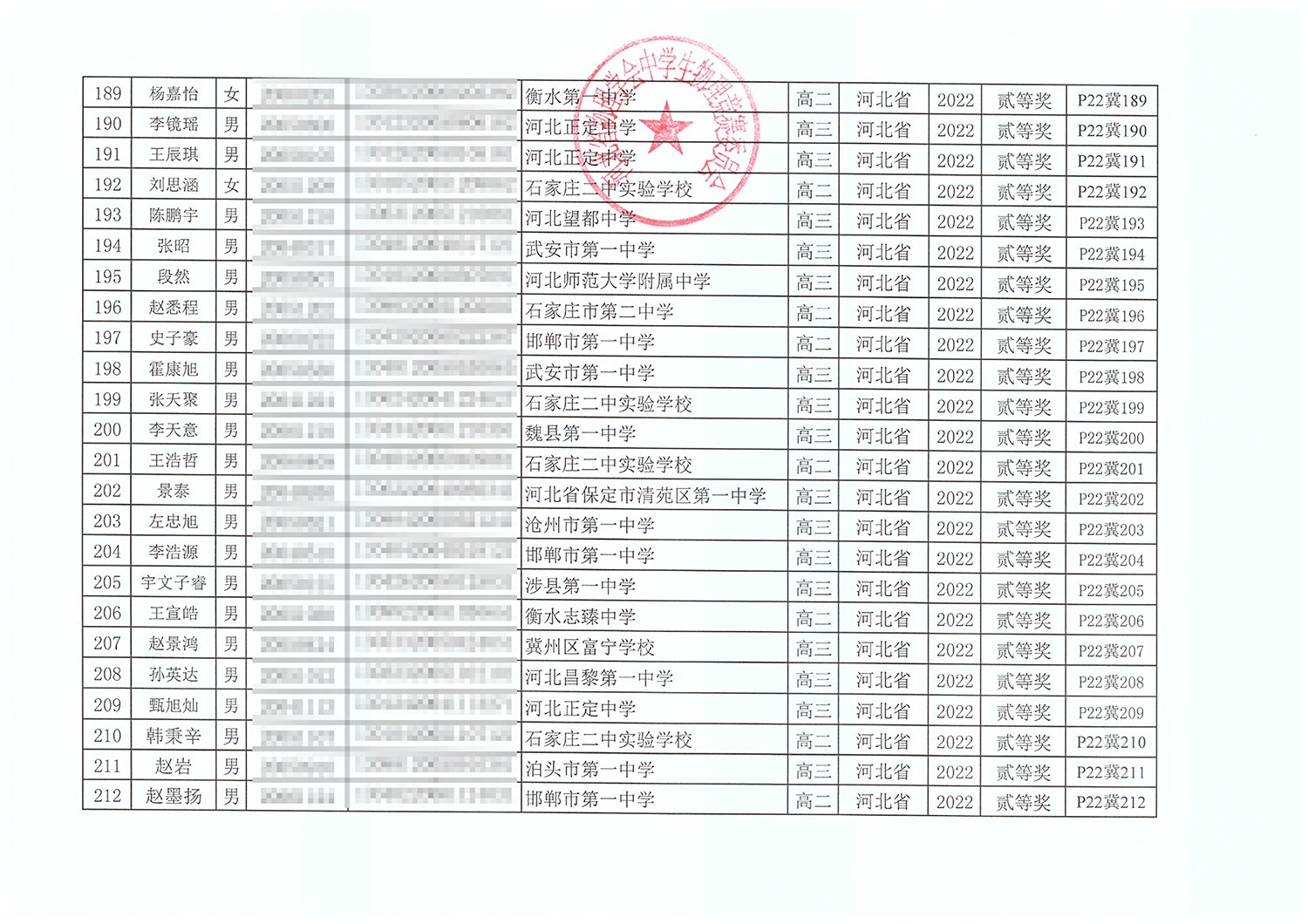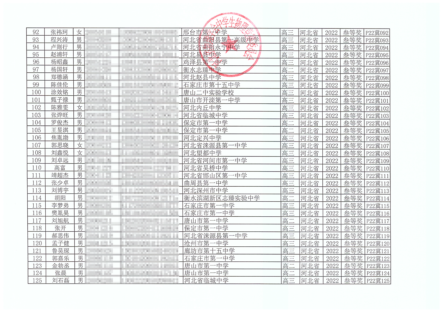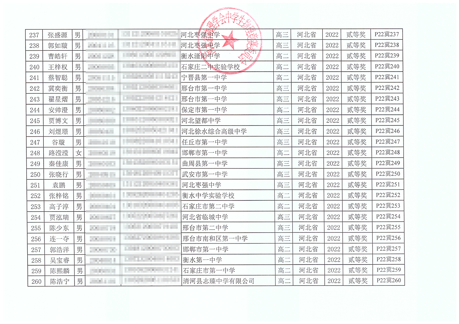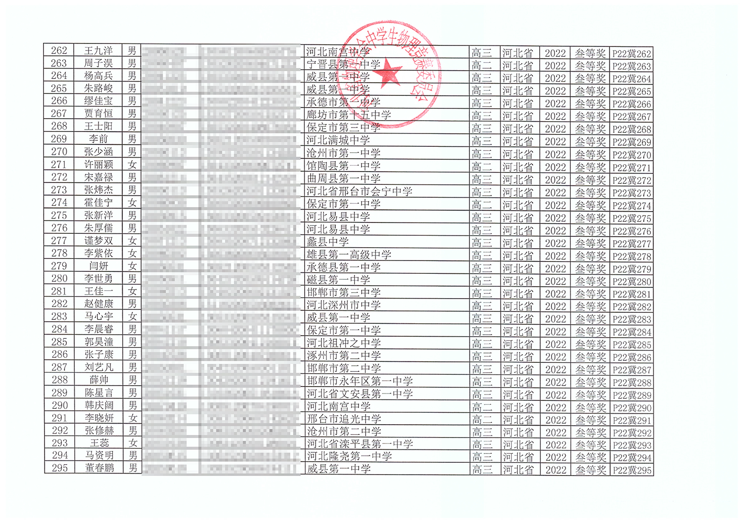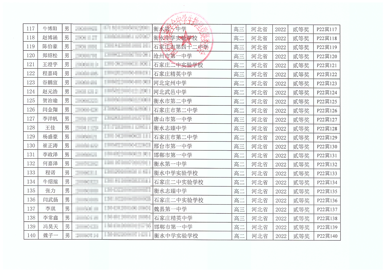 第39届全国中学生物理竞赛河北赛区获奖名单
