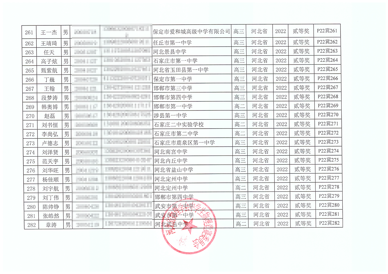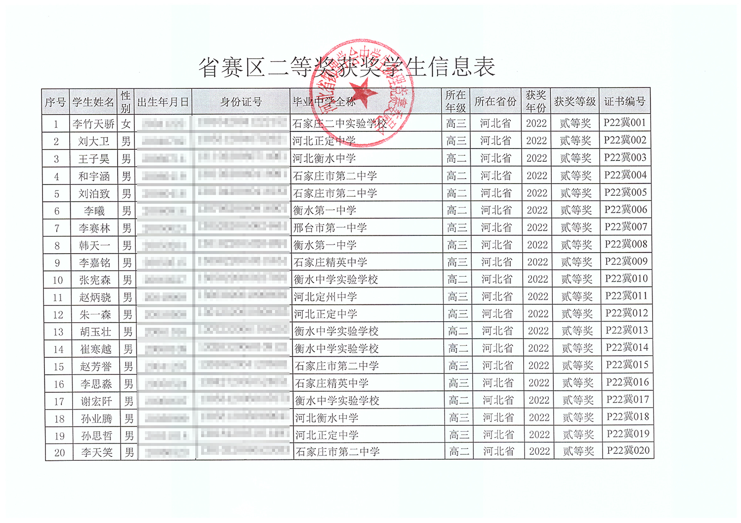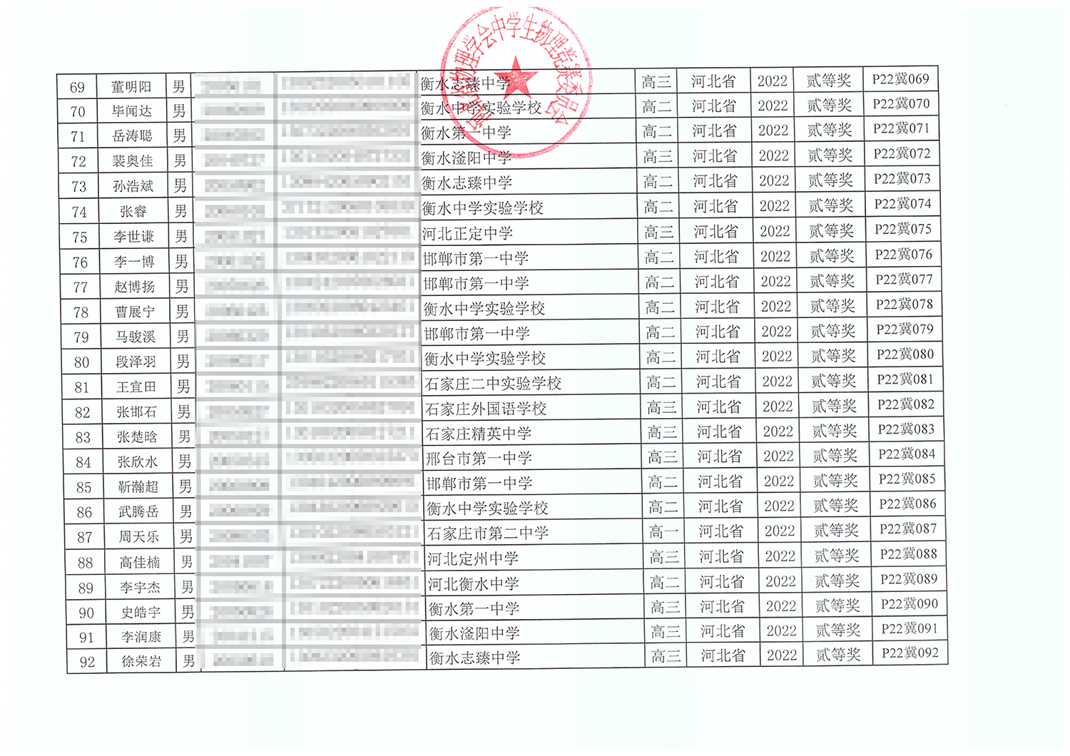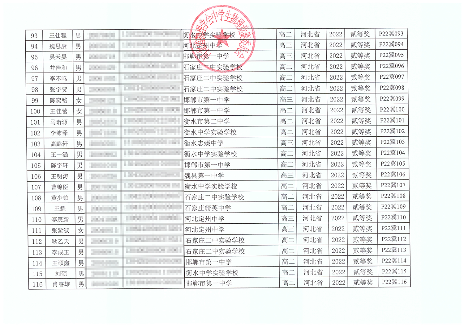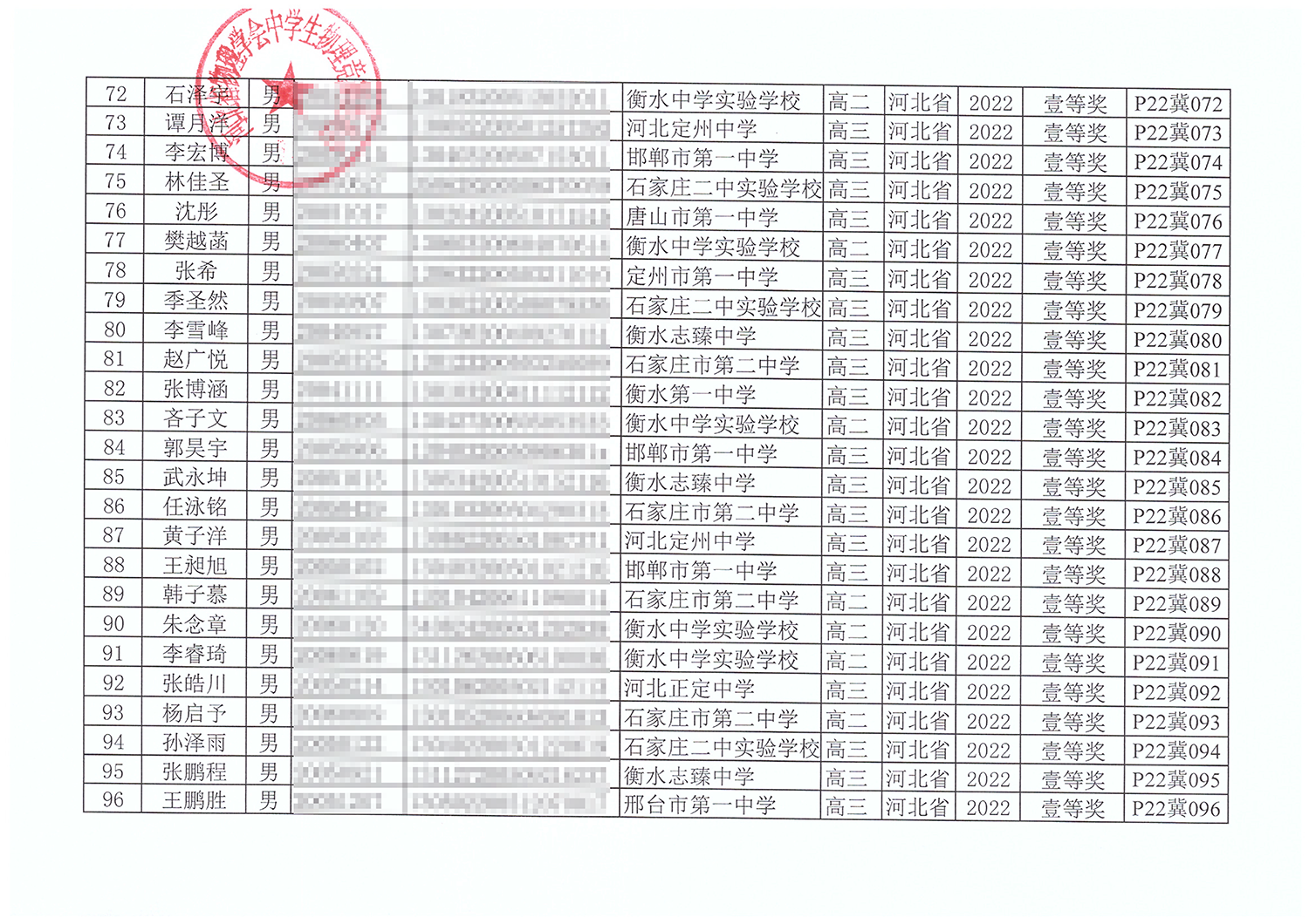 第39届全国中学生物理竞赛河北赛区获奖名单